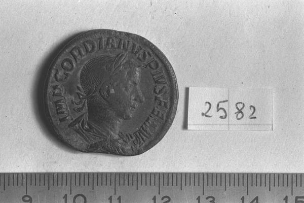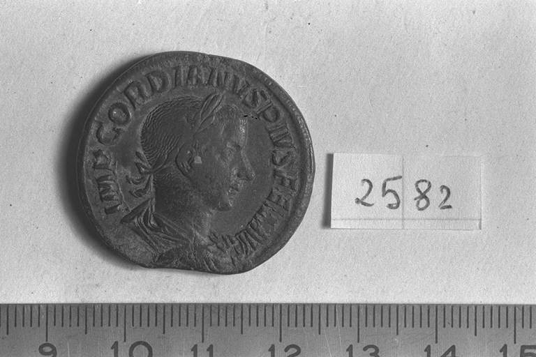 Recto: Busto laureato, drappeggiato e corazzato di Gordiano III, a destra . Contorno di perline.\nVerso: Apollo, a torso nudo, seduto, a sinistra, in trono, con ramo nella destra protesa, appoggia il gomito sinistro alla lyra. Contorno di perline.