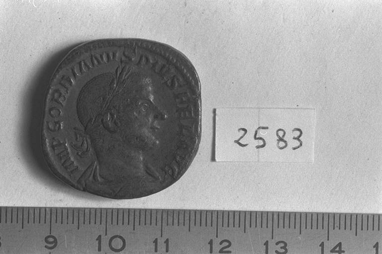 Recto: Busto laureato, drappeggiato e corazzato di Gordiano III, a destra . Contorno di perline.\nVerso: Felicitas, diademata e drappeggiata, stante, a sinistra, con lungo caduceo nella destra e cornucopia nella sinistra. Contorno di perline.