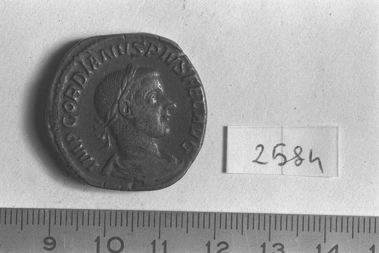 Recto: Busto laureato, drappeggiato e corazzato di Gordiano III, a destra . Contorno di perline.\nVerso: Securitas, velata e drappeggiata, stante, a sinistra, a gambe incrociate, con scettro nella destra, si appoggia con il gomito sinistro alla colonna. Contorno di perline.