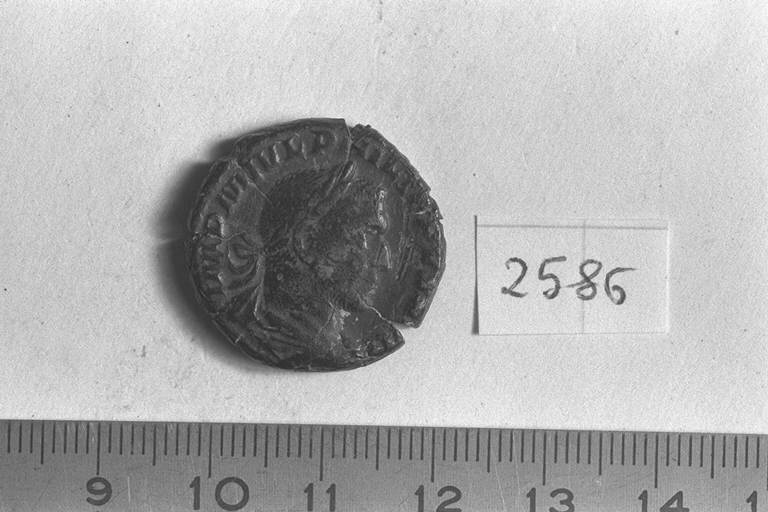 Recto: Busto laureato, drappeggiato e corazzato di Filippo I, a destra . Contorno di perline.\nVerso: Felicitas, drappeggiata, stante, a sinistra, con lungo caduceo nella destra e cornucopia nella sinistra. Contorno di perline.