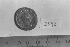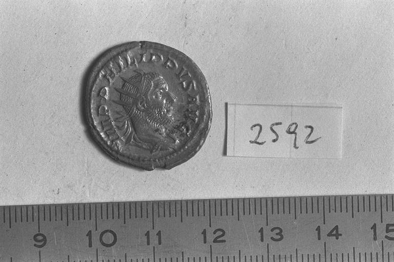 Recto: Busto radiato, drappeggiato e corazzato di Filippo I, a destra . Contorno di perline.\nVerso: Elefante, condotto dal guidatore con pungolo e frusta, gradiente a sinistra. Contorno di perline.