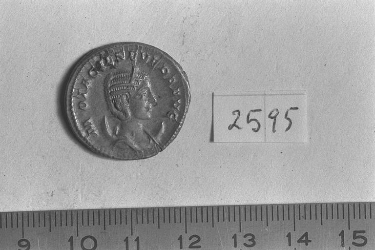 Recto: Busto diademato e drappeggiato su crescente di M. Otacilia Severa, a destra . Contorno di perline.\nVerso: Concordia, drappeggiata, seduta su seggio, a sinistra, con patera nella destra protesa e doppia cornucopia nella sinistra. Contorno di perline.