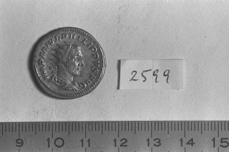 Recto: Busto radiato, drappeggiato e corazzato di Filippo I, a destra . Contorno di perline.\nVerso: Annona, drappeggiata, stante, a sinistra, con spighe di grano su modius nella destra e cornucopia nella sinistra. Contorno di perline.