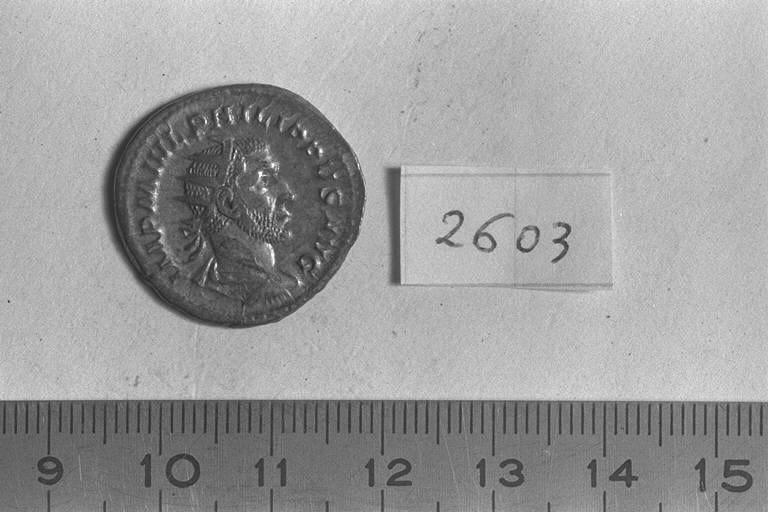 Recto: Busto radiato, drappeggiato e corazzato di Filippo I, a destra . Contorno di perline.\nVerso: Liberalitas, drappeggiata, stante, a sinistra, con abacus nella destra e cornucopia nella sinistra. Contorno di perline.