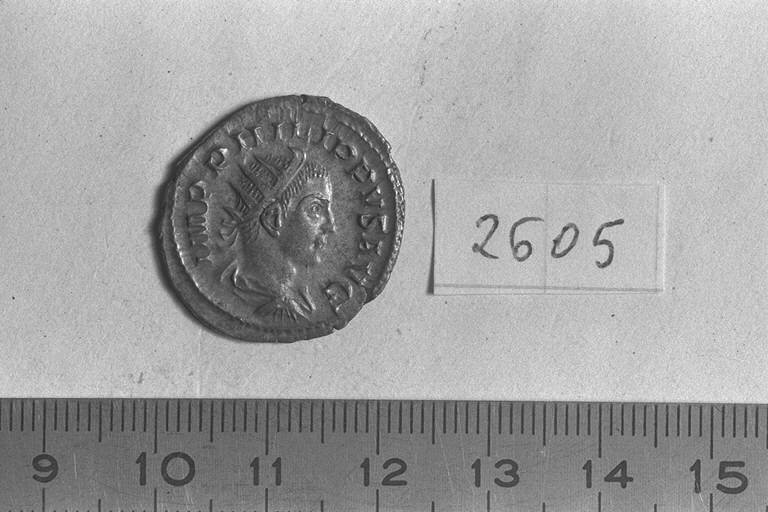 Recto: Busto radiato, drappeggiato e corazzato di Filippo II, a destra . Contorno di perline.\nVerso: Filippo I e II, togati, seduti, a sinistra, su sellae curules; Filippo I, in primo piano, regge uno scettro corto. Contorno di perline.