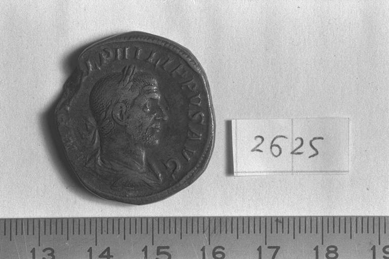 Recto: Busto laureato, drappeggiato e corazzato di Filippo I, a destra . Contorno di perline.\nVerso: Pax, diademata e drappeggiata, in corsa, a sinistra, con ramo nella destra levata e scettro nella sinistra. Contorno di perline.