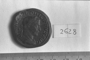 Recto: Busto laureato, drappeggiato e corazzato di Filippo I, a destra . Contorno di perline.\nVerso: Filippo I, in vesti militari, a cavallo al passo, a sinistra, leva la destra, impugnando nella sinistra la lancia. Contorno di perline.