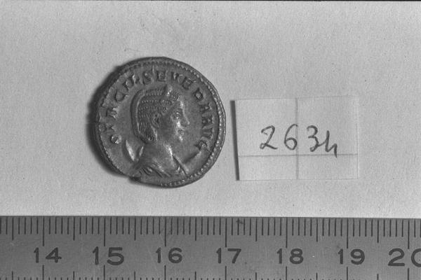 Recto: Busto diademato e drappeggiato su crescente di M. Otacilia Severa, a destra . Contorno di perline.\nVerso: Pietas, drappeggiata, stante, a sinistra, leva la destra e tiene nella sinistra un contenitore per sostanze profumate. Contorno di perline.