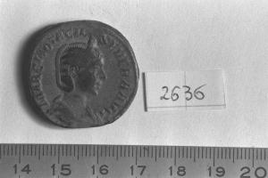 Recto: Busto diademato e drappeggiato di M. Otacilia Severa, a destra . Contorno di perline.\nVerso: Concordia, drappeggiata, seduta su seggio, a sinistra, con patera nella destra protesa e doppia cornucopia nella sinistra. Contorno di perline.