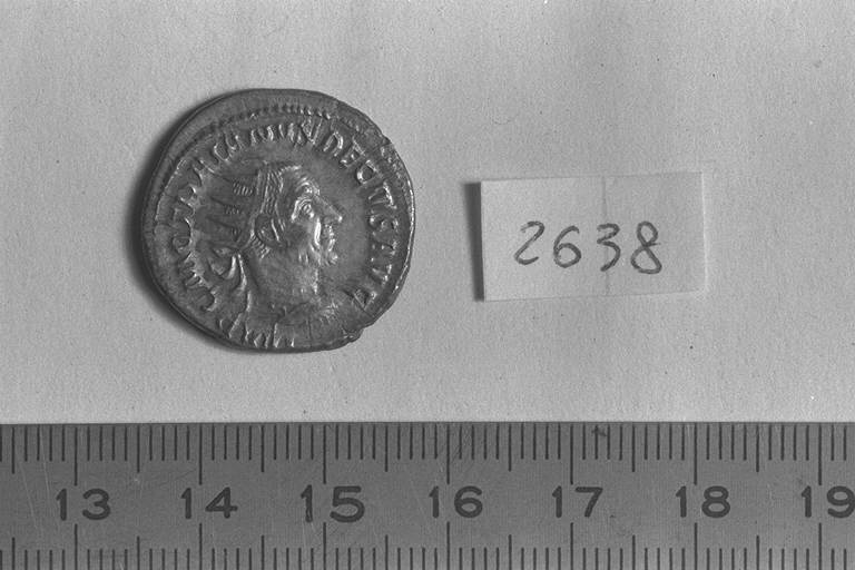 Recto: Busto radiato, drappeggiato e corazzato di Traiano Decio, a destra . Contorno di perline.\nVerso: Dacia, avvolta in una veste lunga sino a terra, stante, a sinistra, con stendardo nella destra. Contorno di perline.