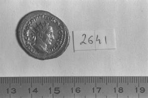Recto: Busto radiato, drappeggiato e corazzato di Traiano Decio, a destra . Contorno di perline.\nVerso: Dacia, avvolta in una veste lunga sino a terra, stante, a sinistra, con asta a testa d'asino nella destra. Contorno di perline.