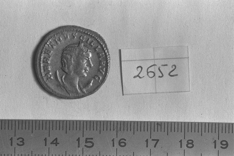 Recto: Busto diademato e drappeggiato su crescente di Herennia Etruscilla, a destra . Contorno di perline.\nVerso: Fecunditas, drappeggiata, stante, a sinistra, protende la destra sopra il capo di un bambino, stante, a destra , che le tende le braccia e tiene nella sinistra la cornucopia. Contorno di perline.