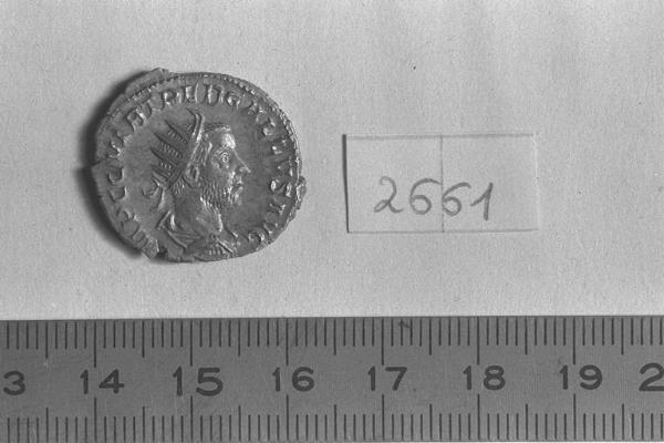 Recto: Busto radiato, drappeggiato e corazzato di Treboniano Gallo, a destra . Contorno di perline.\nVerso: Pax, drappeggiata, stante, a sinistra, con ramo nella destra levata e scettro trasversale nella sinistra. Contorno di perline.
