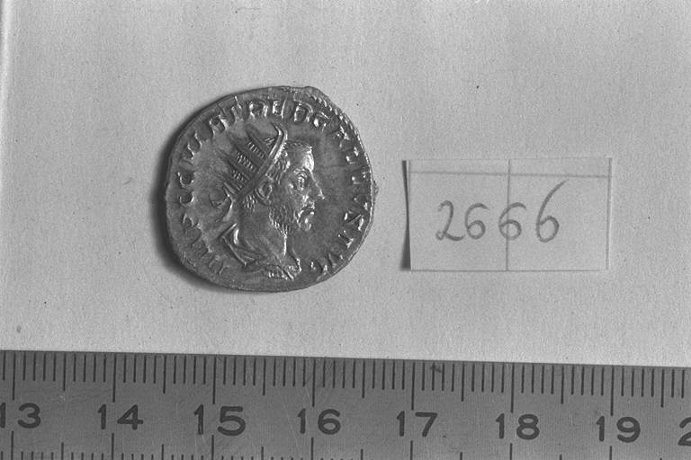 Recto: Busto radiato, drappeggiato e corazzato di Treboniano Gallo, a destra . Contorno di perline.\nVerso: Pax, drappeggiata, stante, a sinistra, con ramo nella destra levata e scettro trasversale nella sinistra. Contorno di perline.