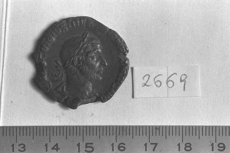 Recto: Busto laureato, drappeggiato e corazzato di Treboniano Gallo, a destra . Contorno di perline.\nVerso: Virtus, con elmo e vesti militari, stante, a sinistra, posa la destra sullo scudo oblungo a terra e impugna la lancia riversa nella sinistra. Contorno di perline.