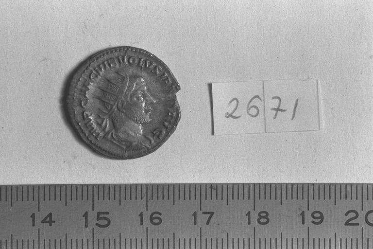Recto: Busto radiato, drappeggiato e corazzato di Volusiano, a destra . Contorno di perline.\nVerso: Virtus, con elmo e vesti militari, stante, a sinistra, appoggia la destra allo scudo oblungo collocato a terra e impugna la lancia nella sinistra.; nel campo, a destra , stella. Contorno di perline.