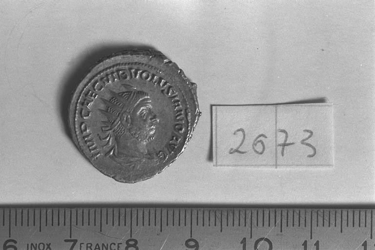 Recto: Busto radiato, drappeggiato e corazzato di Volusiano, a destra . Contorno di perline.\nVerso: Volusiano, togato, stante, a sinistra, con ramo nella destra levata e scettro trasversale nella sinistra.. Contorno di perline.