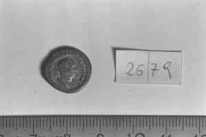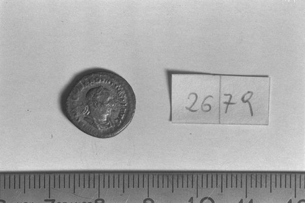 Recto: Busto laureato e drappeggiato di Valeriano I, a destra . Contorno di perline.\nVerso: Valeriano I, con elmo e vesti militari, stante, a sinistra, in atto di aiutare con la destra una figura femminile inginocchiata, a destra , a risollevarsi, impugnando la lancia nella sinistra. Contorno di perline.