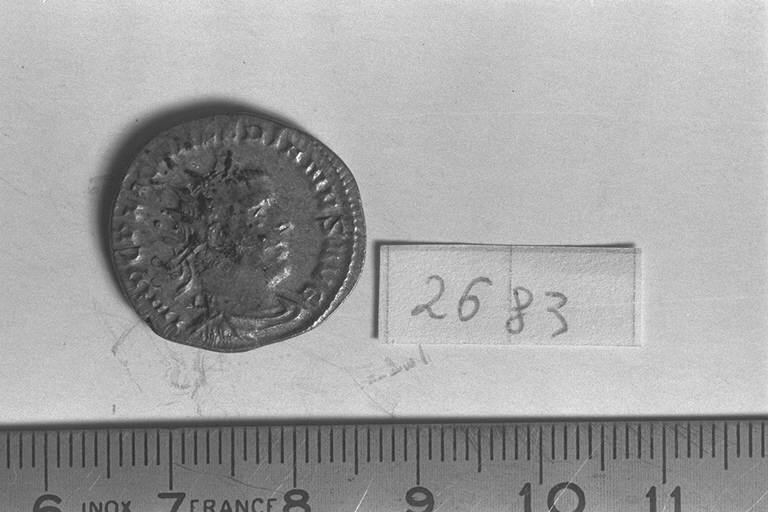 Recto: Busto radiato, drappeggiato e corazzato di Valeriano I, a destra , visto davanti. Contorno di perline.\nVerso: Victoria, alata, drappeggiata, stante, a sinistra, con corona nella destra e ramo di palma contro la spalla nella sinistra. Contorno di perline.