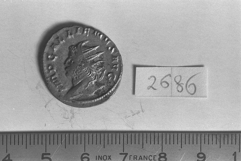 Recto: Testa radiata di Gallieno, a d, di spalle. Contorno di perline.\nVerso: Victoria, alata, drappeggiata, stante, di fronte, rivolta a sinistra, con diadema nelle mani; a sinistra e a destra , scudo. Contorno di perline.
