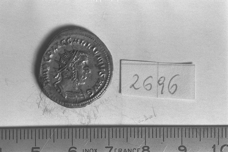 Recto: Busto radiato e corazzato di Gallieno, a d, visto dalla fronte. Contorno di perline.\nVerso: Soldato, con elmo e vesti militari, stante, a sinistra, appoggia la destra allo scudo collocato a terra e impugna la lancia nella sinistra.. Contorno di perline.