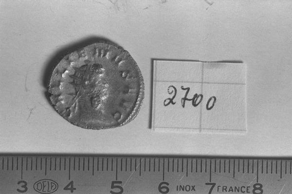 Recto: Testa radiata di Gallieno, a destra .. Contorno di perline.\nVerso: Diana, con crescente lunare in capo e vesti da caccia, stante, a destra ,con lancia nella destra e arco nella sinistra; davanti, capriolo, in corsa, a destra . Contorno di perline.