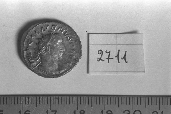 Recto: Busto radiato, drappeggiato e corazzato di Gallieno, a d, visto dalla fronte. Contorno di perline.\nVerso: Spes, drappeggiata, gradiente, a sinistra, con fiore nella destra levata, solleva con la sinistra un lembo della veste. Contorno di perline.