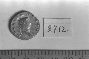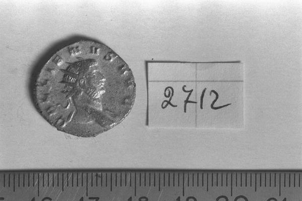 Recto: Testa radiata di Gallieno, a d, di spalle, con lembo di drappeggio sulla spalla. Contorno di perline.\nVerso: Fides, drappeggiata, stante, rivolta a destra , con aquila legionaria nella destra e insegna trasversale nella sinistra. Contorno di perline.