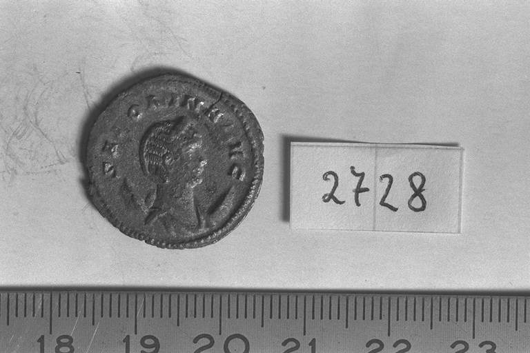 Recto: Busto diademato e drappeggiato su crescente di Salonina, a destra . Contorno di perline.\nVerso: Pietas, velata e drappeggiata, stante, a sinistra, tende la destra levata e regge un contenitore nella sinistra. Contorno di perline.