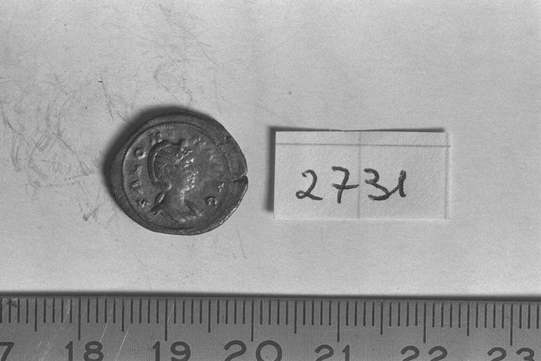 Recto: Busto diademato e drappeggiato di Salonina, a destra . Contorno di perline.\nVerso: Giunone, diademata e drappeggiata, stante, a sinistra, con patera nella destra e scettro nella sinistra. Contorno di perline.