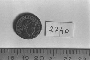 Recto: Testa laureata di Divo Claudio II il Gotico, a destra . Contorno di perline.\nVerso: Divo Claudio II il Gotico, togato, seduto, a sinistra, con la destra levata e corto scettro nella sinistra. Contorno di perline.