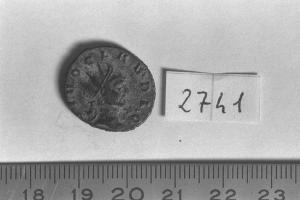 Recto: Testa radiata di Divo Claudio II il Gotico, a destra . Contorno di perline.\nVerso: Aquila stante, volta a destra . Contorno di perline.