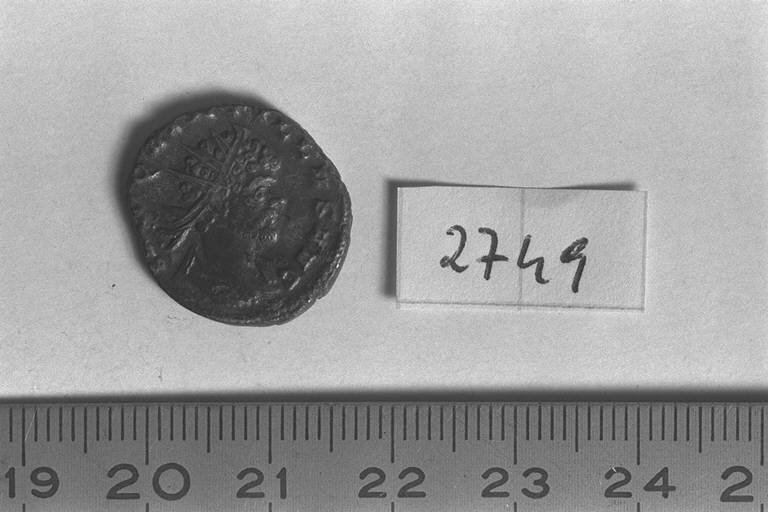 Recto: Busto radiato e drappeggiato di Quintillo, a destra . Contorno di perline.\nVerso: Pax, drappeggiata, stante, a sinistra, con ramo d'olivo nella destra e scettro nella sinistra. Contorno di perline.