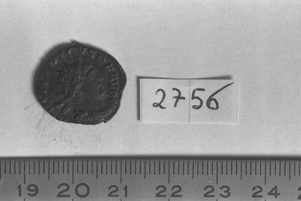 Recto: Busto radiato, drappeggiato e corazzato di Tetrico I /II, a destra , visto dalla fronte. Contorno di perline.\nVerso: Salusinistra drappeggiata, stante, rivolta a sinistra, con patera nella destra e timone nella sinistra; a sinistra, altare, da cui sale avvolgendo le spire per nutrirsi il serpente. Contorno di perline.