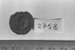 Recto: Busto radiato e drappeggiato di Tetrico Cesare, a destra , visto di spalle. Contorno di perline.\nVerso: Spes, drappeggiata, stante, a sinistra, con fiore nella destra levata, scosta con la sinistra un lembo della veste. Contorno di perline.