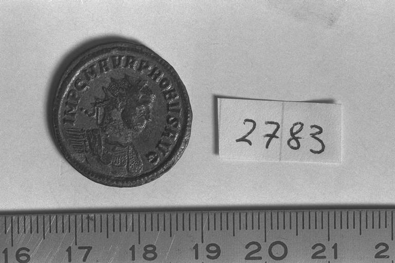 Recto: Busto radiato e corazzato di Probo, a destra , visto dalla fronte. Contorno di perline.\nVerso: Tempio esastilo, all'interno del quale è Roma, seduta, di fronte, rivolta a sinistra, con Victoria nella destra e scettro nella sinistra. Contorno di perline.