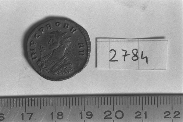 Recto: Busto radiato di Probo, a sinistra, con manto imperiale e scettro aquilifero. Contorno di perline.\nVerso: Salus, drappeggiata, stante, a destra , nutre il serpente che tiene nella sinistra. Contorno di perline.