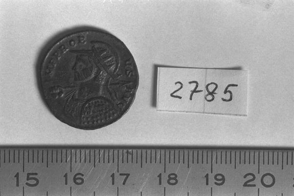 Recto: Busto elmato, radiato e corazzato di Probo, a sinistra, con lancia e scudo. Contorno di perline.\nVerso: Tempio esastilo, all'interno del quale è Roma, seduta, di fronte, rivolta a sinistra, con Victoria nella destra e scettro nella sinistra. Contorno di perline.