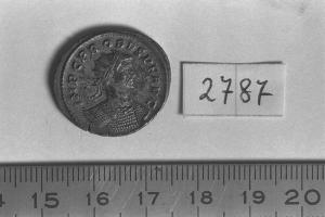 Recto: Busto radiato e corazzato di Probo, a destra , visto dalla fronte. Contorno di perline.\nVerso: Salus, drappeggiata, stante, a destra , nutre il serpente che regge nella sinistra. Contorno di perline.