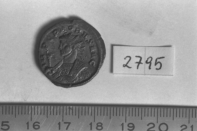 Recto: Busto radiato di Probo, a sinistra, con manto imperiale e scettro aquilifero. Contorno di perline.\nVerso: Securitas, drappeggiata, stante, di fronte, rivolta a sinistra, a gambe incrociate, porta la destra alla testa, appoggiandosi con il gomito sinistro alla colonna.. Contorno di perline.