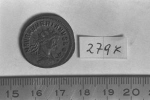 Recto: Busto radiato, drappeggiato e corazzato di Numeriano Cesare, a destra , visto dalle spalle. Contorno di perline.\nVerso: Numeriano, stante, a sinistra, con bastone nella destra e scettro trasversale nella sinistra. Contorno di perline.