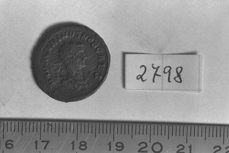 Recto: Busto radiato, drappeggiata e corazzato di Carino Cesare, a destra ., visto dalla fronte. Contorno di perline.\nVerso: Strumenti sacrificali. Contorno di perline.