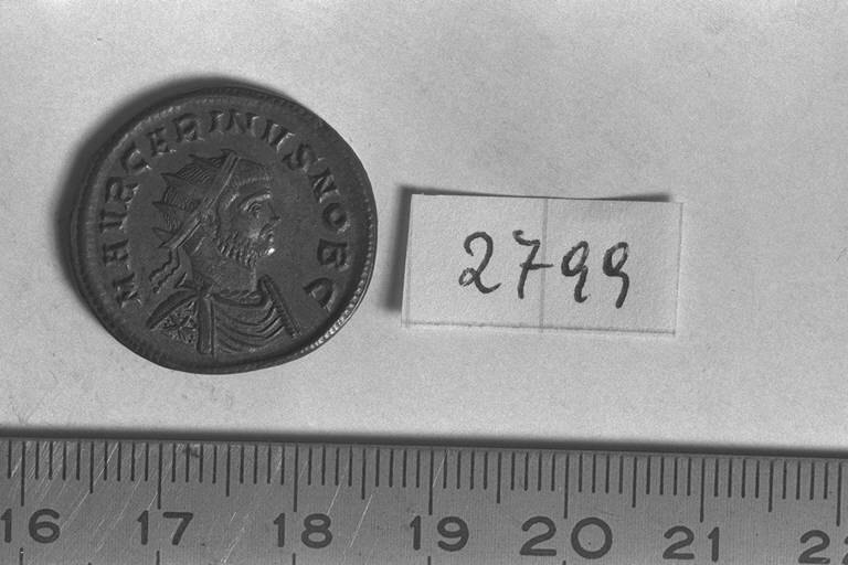 Recto: Busto radiato, drappeggiato e corazzato di Carino Cesare, a destra , visto dalla fronte. Contorno di perline.\nVerso: Carino, in vesti militari, stante, di fronte, rivolto a sinistra, con globo nella destra protesa e lancia nella sinistra; a sinistra, prigioniero con le mani legate, a terra. Contorno di perline.