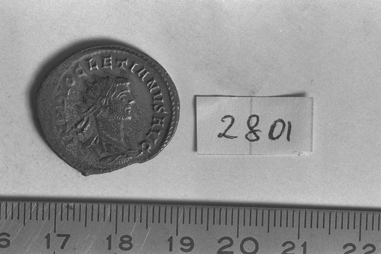 Recto: Busto radiato, drappeggiato e corazzato di Diocleziano, a destra , visto dalla fronte. Contorno di perline.\nVerso: Giove, nudo, con mantello che scende dietro le spalle, fulmine nella destra e scettro nella sinistra. Contorno di perline.