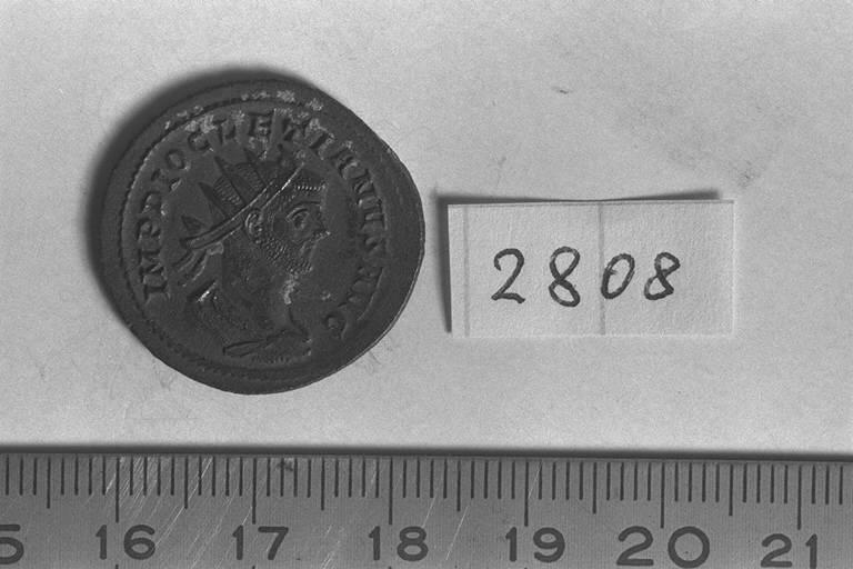 Recto: Busto radiato, drappeggiato e corazzato di Diocleziano, a destra . Contorno di perline.\nVerso: Giove, nudo, con mantello che pende dalle spalle, fulmine nella destra e scettro nella sinistra. Contorno di perline.