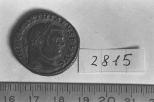 Recto: Testa laureata di Massimiano Erculeo, a destra . Contorno di perline.\nVerso: La Moneta, drappeggiata, stante, di fronte, rivolta a sinistra, con bilancia nella destra e cornucopia nella sinistra. Contorno di perline.