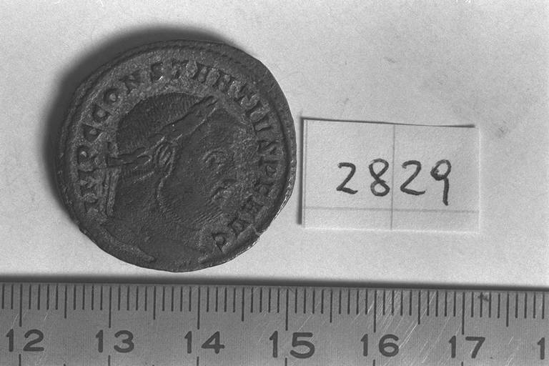 Recto: Testa laureata di Costanzo Cloro Augusto, a destra . Contorno di perline.\nVerso: Fides, drappeggiata, seduta su seggio, a sinistra, con un'insegna per mano. Contorno di perline.