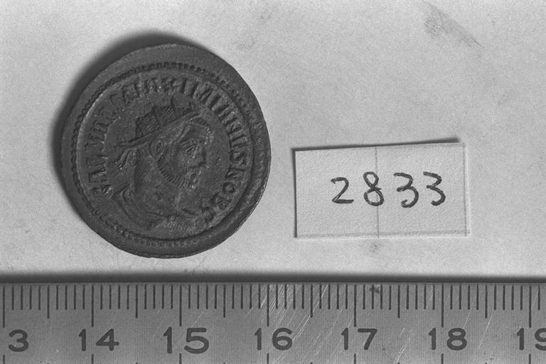 Recto: Busto radiato, drappeggiato e corazzato di Galerio Massimiano Cesare, a destra , visto di spalle. Contorno di perline.\nVerso: Giove, in corsa, a sinistra, con fulmine nella destra e aquila sulla mano sinistra. Contorno di perline.