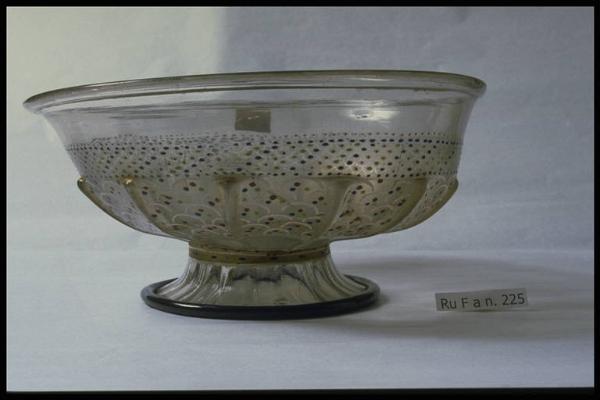 Orlo ingrossato; labbro estroflesso; coppa emisferica depressa in vetro incolore; basso piede troncoconico schiacciato in vetro incolore, decorato a stampo a coste verticali; filamento vitreo blu applicato lungo il bordo. La coppa è decorata da circa metà della sua altezza fino all'impostazione del piede da una decorazione a smalto e foglia d'oro, costituita superiormente da cinque file alternate di piccole pelte a foglia d'oro rivolte verso il basso, sottolineate da punti in vetro bianco-rosso, blu e verde, delimitate superiormente da una doppia linea puntinata bianco-rossa e blu, e inferiormente da una linea puntinata blu. Al di sotto, compresa tra larghe costolature a testa arrotondata ottenute con la tecnica della mezza stampatura, vi è una decorazione di sei file alternate di pelte, di maggiori dimensioni, rivolte verso l'alto, tracciate in smalto bianco, sottolineate da tre punti di color verde, rosso e blu. Inferiormente corre una linea puntinata bianco-rossa. Sotto la coppa, a