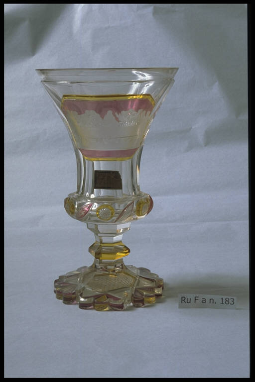 Orlo arrotondato; coppa con alta imboccatura troncoconica e fondo espanso; stelo sagomato; piede svasato con bordo sagomato a fiore. Imboccatura ornata da una fascia decorativa costituita da tre medaglioni in rilievo, due laterali con un reticolato a cesto molato al centro e bordo giallo e rosa, ed uno centrale con reticolato esagonale e bordo rosa; nei bordi sono intagliati dei motivi a festone floreale. Nella stessa fascia, inscritta in una cornice rettangolare ad angoli smussati di colore giallo, è incisa l'Ultima Cena di Leonardo da Vinci su sfondo rosa. Sul fondo espanso della coppa sono intagliati a rilievo medaglioni ovali con un motivo reticolato ottagonale al centro, inscritti in cornici gialle, alternati a dei medaglioni lanceolati rosa con motivi floreali molati. Sul fondo del piede è intagliata una stella reticolata a sei punte centrale, con elmenti a tre petali rosa e gialli e motivi floreali compresi tra i vertici della stella.